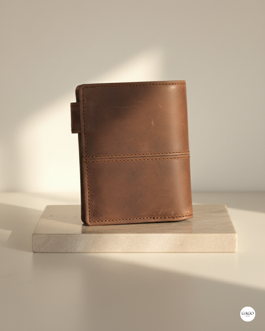 Wallet wallet made of vintage oiled calf leather by our expert craftsmen in Ubrique, Spain. Bicolour leather and black. It has two compartments for notes, six compartments for cards, a coin purse with clip closure, an integrated photo holder and a leather clasp for closure.