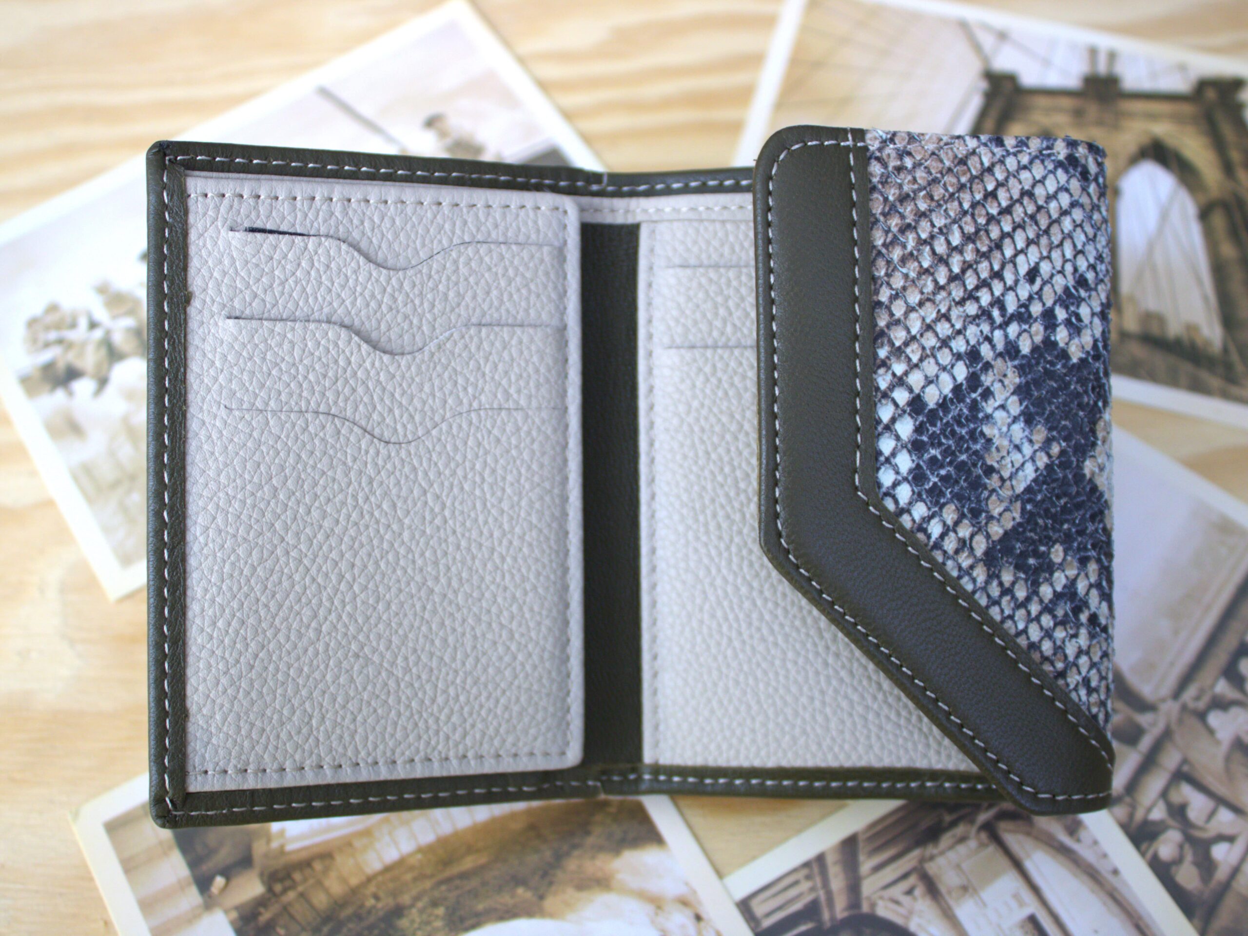 Cartera mujer pequeña piel serpiente y oliva